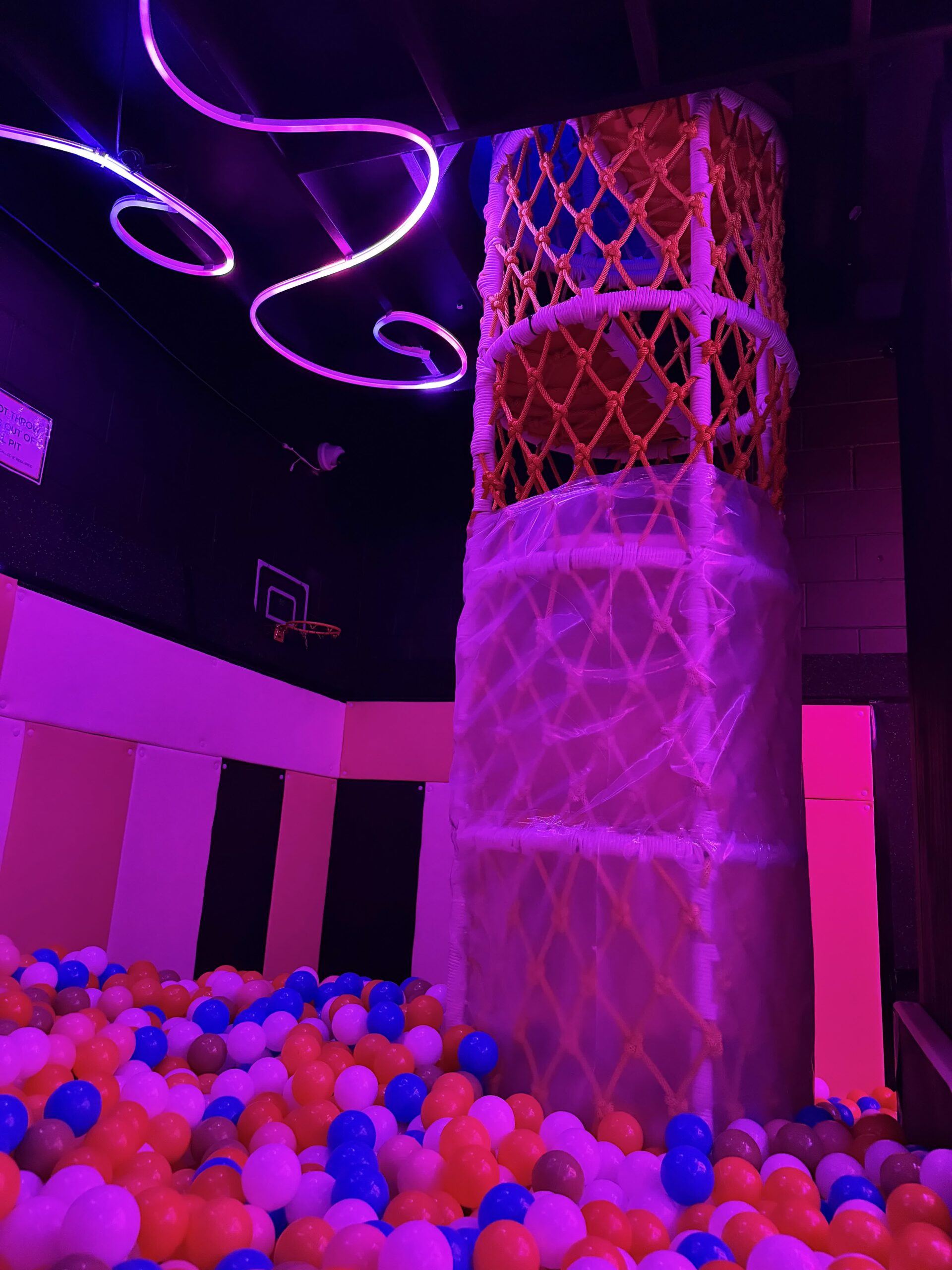 Our vibrant rock wall is bursting with colour and challenge. Grip, scramble, and conquer as you float above a sea of glowing balls. The most playful climb you’ll ever take!
